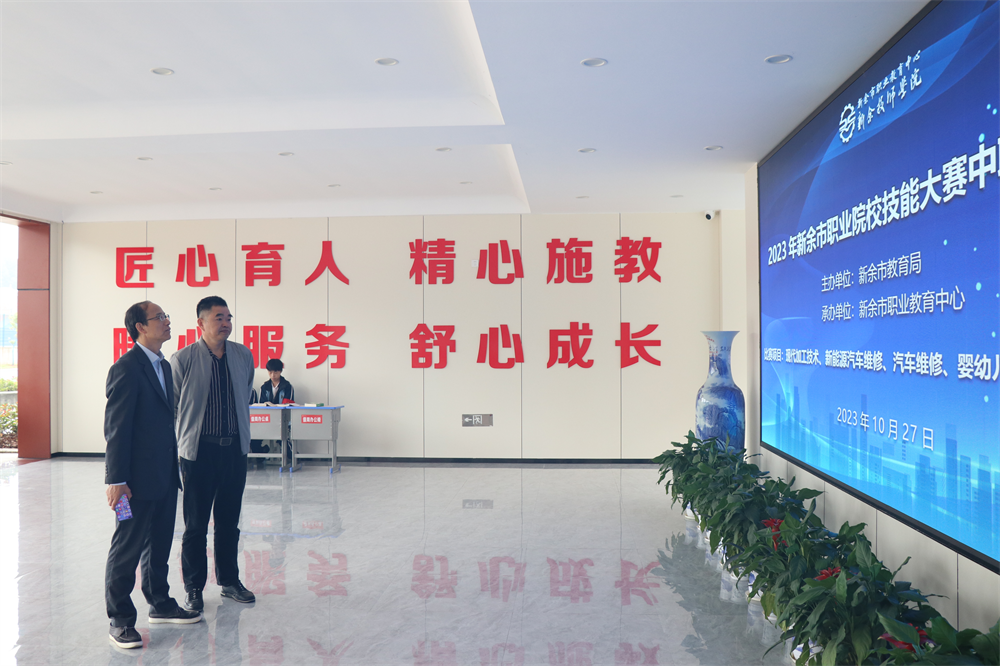 比赛期间,新余市教育局职成科科长易建儿带队莅临市职教中心赛区比赛现场,在校长任凤生、副校长邹建峰的陪同下对各个赛项进行巡视,对各个赛项进行针对性指导。
