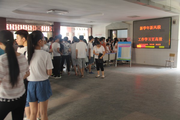9月1日,学校2016年秋季开学报名工作正式拉开帷幕。校园公示栏上学校教室分布平面图、班主任名单、收费公示以及四周树立的安全标语十分醒目,教学楼电子屏幕上“欢迎新同学”、“ 新学期、新起点、新高度、新挑战、新希望”横幅标语更是透出温馨的暖意,20名教师、学生志愿者分布在校门口、招生办、教学楼、宿舍楼为前来报到的新生提供帮助。
