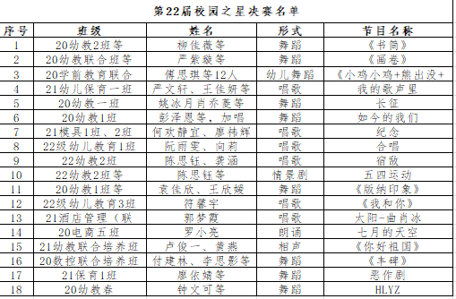 比赛过程中,各位参赛选手们展现了自己多才多艺的一面、用精神饱满的状态,让自己表演更加精彩纷呈。优美欢快的舞蹈表演,用流畅的舞蹈动作、充满韵律的节拍 ,带动了全场的气氛。动听的歌声,饱含演唱者的情感。参赛选手的表演节目各有千秋,但每一位参赛选手都很好的展现了职教中心同学们热情活力和积极投入的青春风貌。最终有以下节目入围决赛: